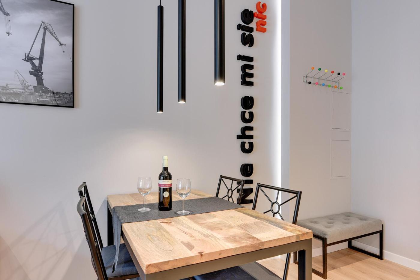 Oferta apartamentu obejmuje sypialnię (1), salon, aneks kuchenny z pełnym wyposażeniem, w tym lodówką i ekspresem do kawy, a także łazienkę (1) z prysznicem oraz suszarką do włosów. W apartamencie zapewniono ręczniki i pościel.